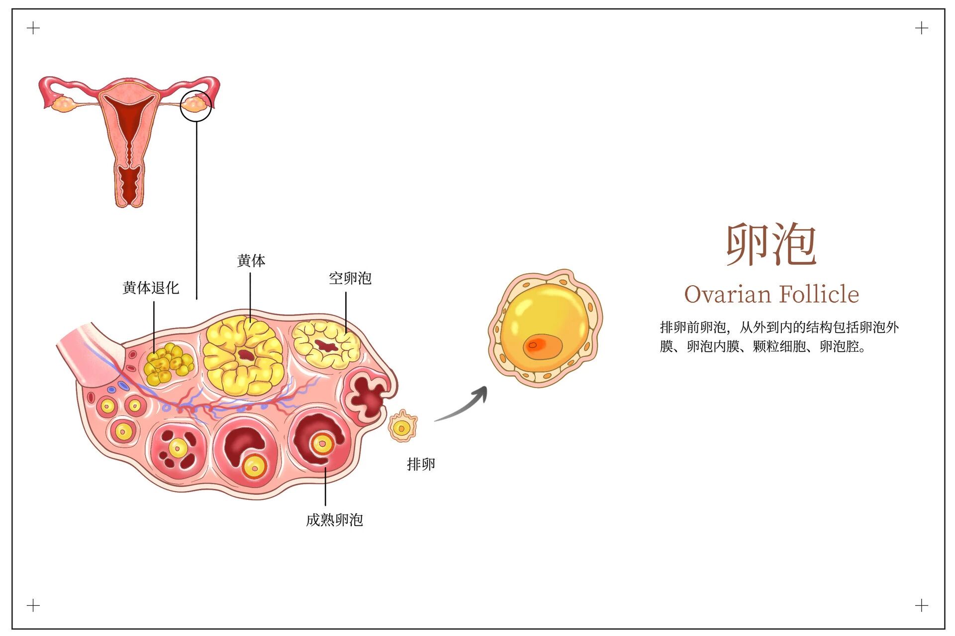 卵泡位于卵巢皮质内,由一个卵母细胞和其周围许多小型卵泡细胞所组成。根据卵泡发育过程的形态和功能变化,可分为原始卵泡、生长卵泡和成熟卵泡三个阶段。