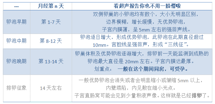 卵泡监测少不了做B超,虽然每次做完后医生都会给诊断结论,但是看不懂上面的解释也让人有点慌。不要怕,下面这个表格让你一目了然。