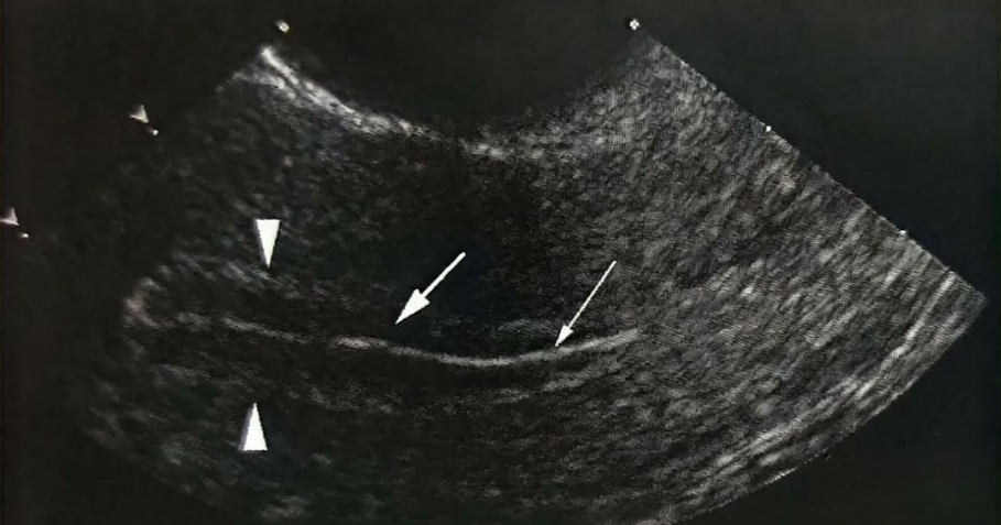 A型内膜常见于增殖晚期。排卵前,雌激素水平增高,功能层内膜增厚,但内膜血管、腺管等结构的数目少、管径细,因此内膜内部的超声反射界面较少、功能层内膜表现为均匀的低回声。低回声的功能层内膜夹在两条高回声的基底层内膜和强回声宫腔线之间,就表现为三线征。如下图: