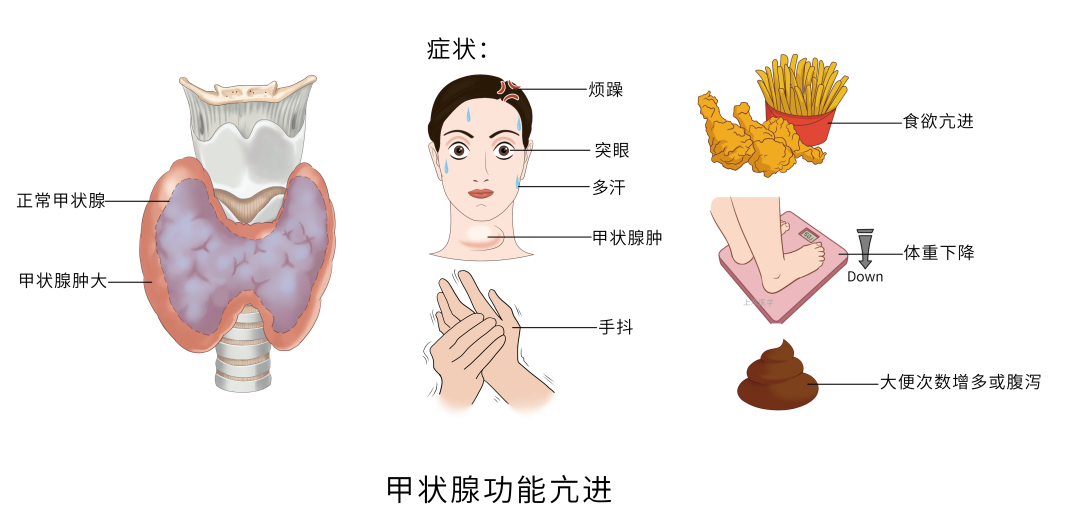 甲状腺功能亢进症,简称为甲亢,是由于甲状腺合成释放过多的甲状腺激素,造成机体代谢亢进和交感神经兴奋,出现心悸、出汗、易饥和排便次数增多且体重减少等表现。