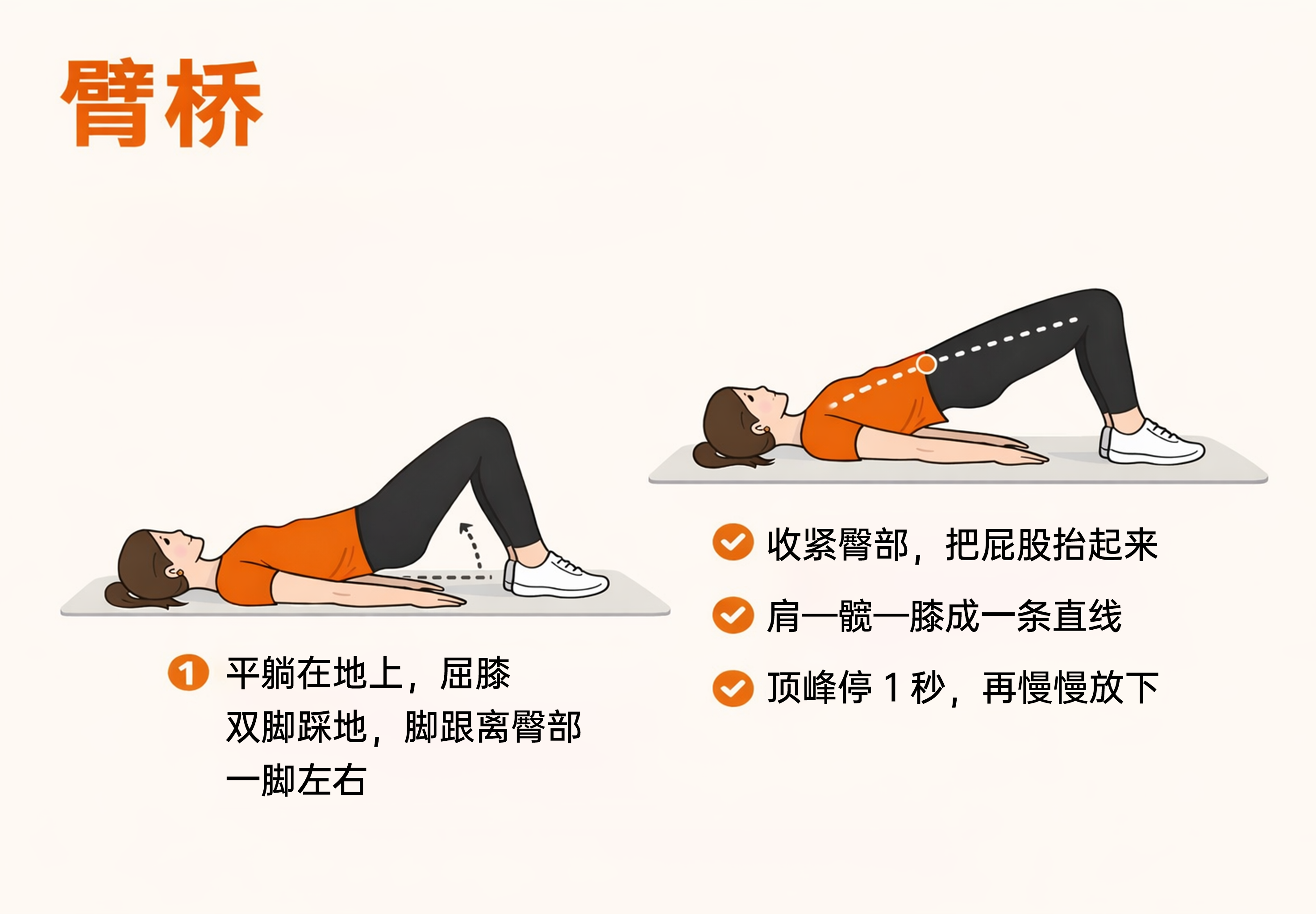 不需要器械,在家就能做。重点是练下肢、臀部、背部和胸部。四个最基础、最安全的动作: