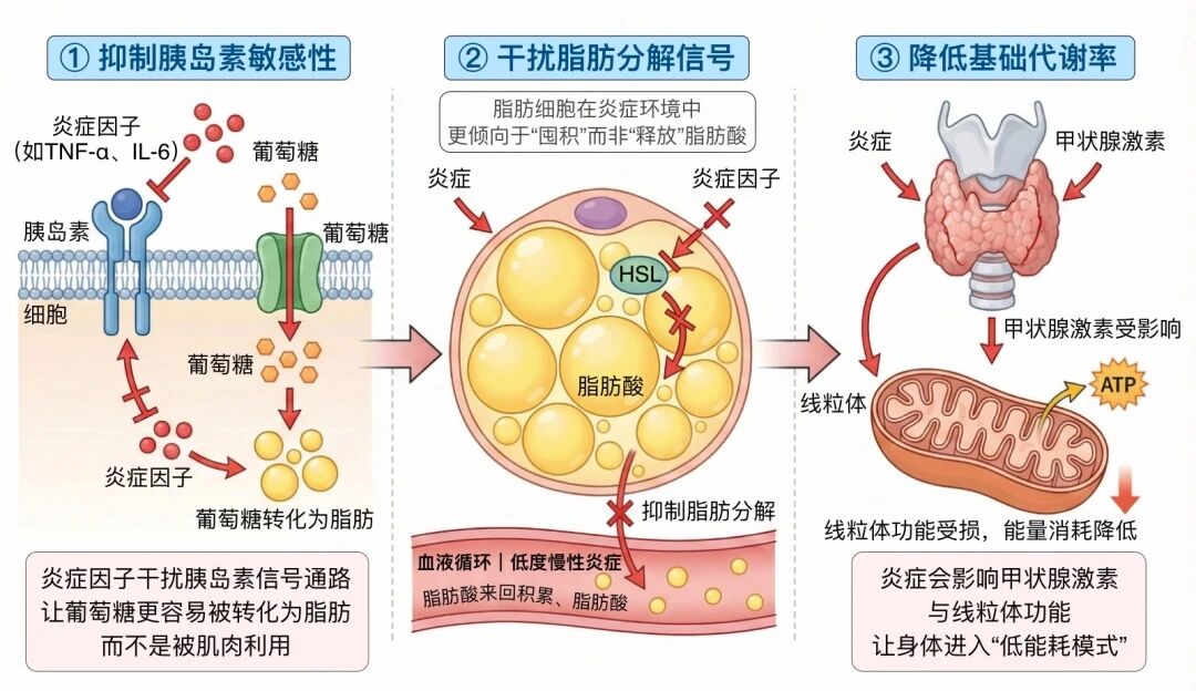 炎症因子会干扰胰岛素信号通路,让葡萄糖更容易被转化为脂肪,而不是被肌肉利用。