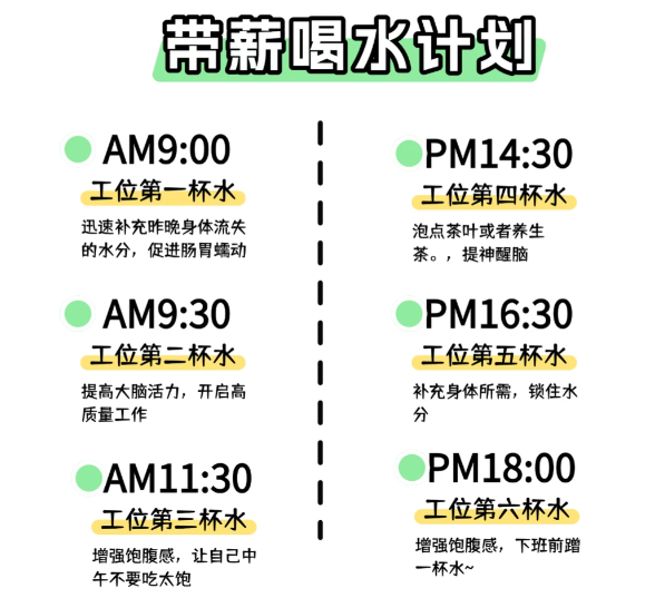 下图是小编在小某书上为不爱喝水的上班牛马找到的带薪喝水“邪修”计划,供参考: