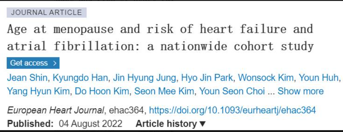 绝经过早,相当于这层保护提前失效。《欧洲心脏杂志》一项研究显示,绝经年龄<40岁的人,患心衰和房颤的风险分别升高了33%和9%。